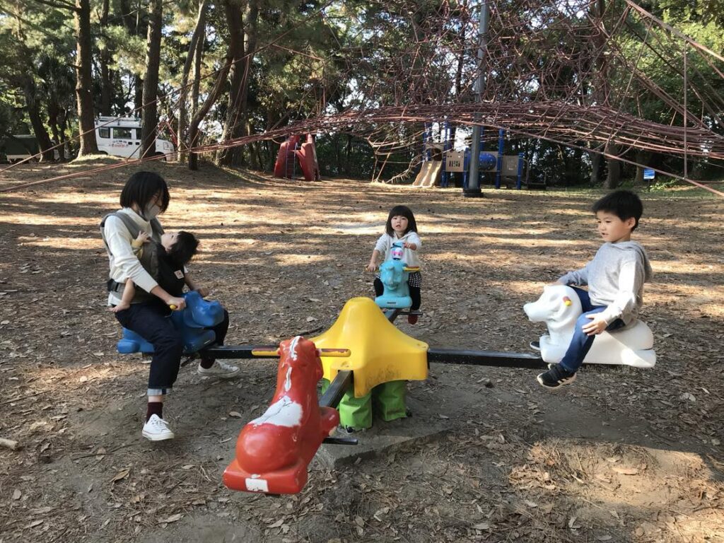 他にも大きめの遊具やロープウェイがあったり、芝生のグラウンドもかなり広いので、子どもたちが走ったりボール遊びができる場所であることもポイントです。