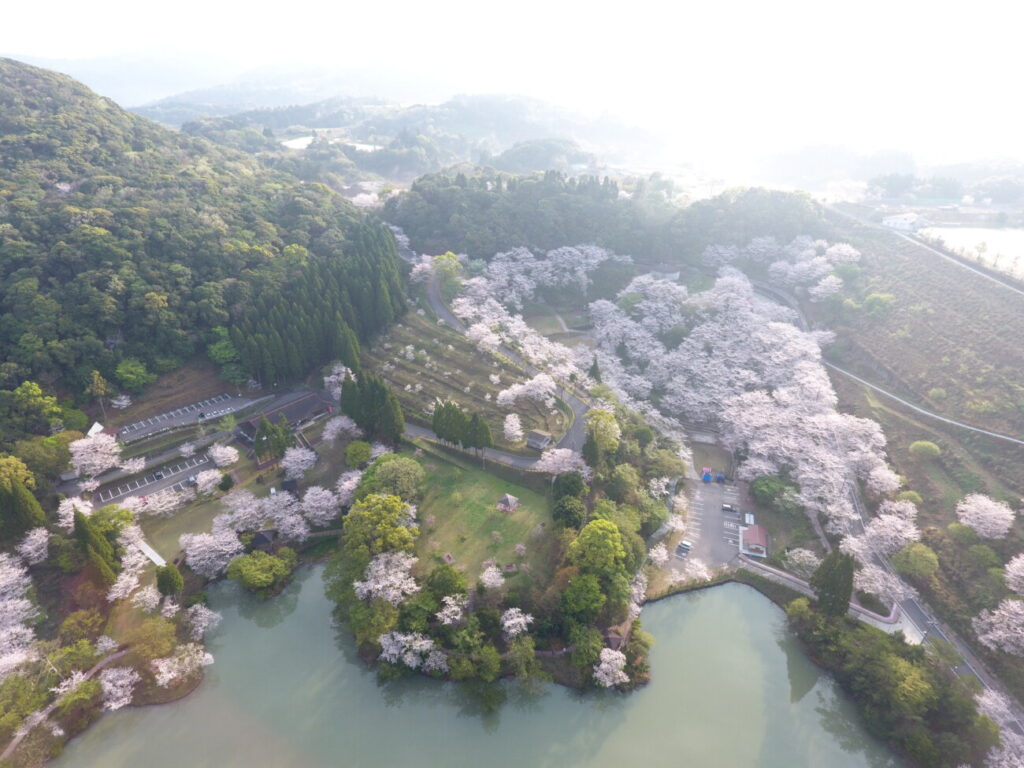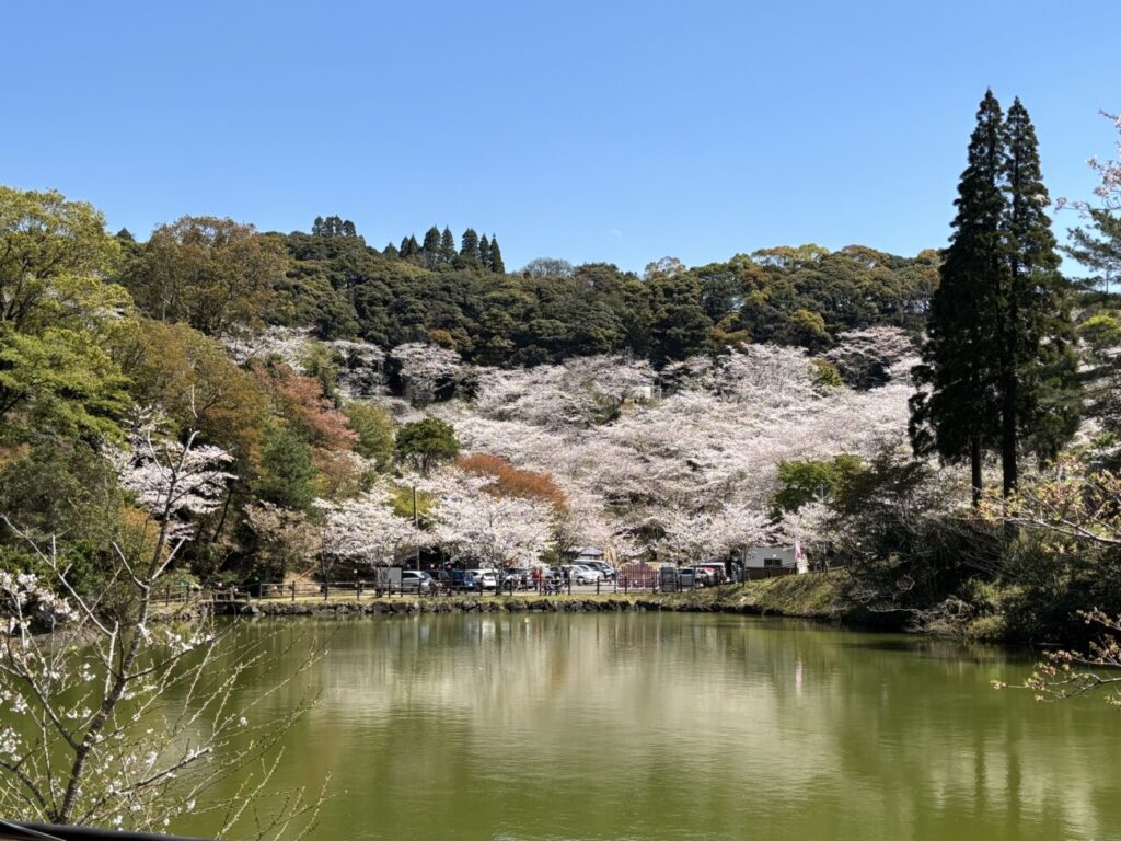 春には、池を囲むように植えられた 千本以上のソメイヨシノ が周囲をピンク色に染めます。