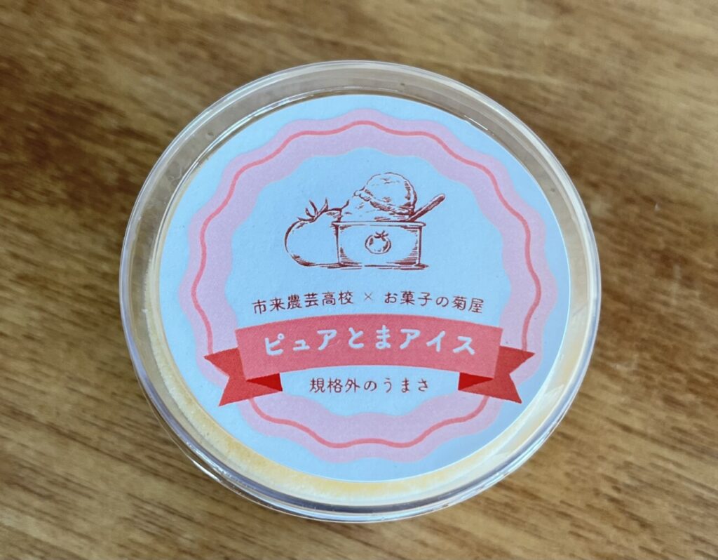 生徒たちが地元の菓子店「お菓子の菊屋」さんと連携して開発したのが、「ピュアとまアイス」です。