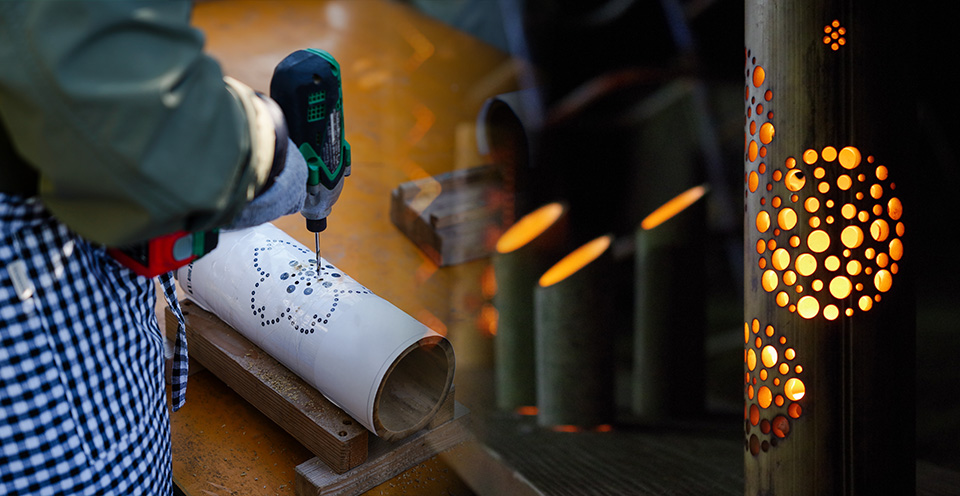 竹用ドリルで穴をあけ、模様をデザインしていくと、世界にひとつの灯りが完成。この体験では、作品づくりを楽しむだけでなく、竹林整備にもつながるのが魅力です。